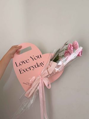 2 seasonal pink flowers wrapped on a thick pink heart card carrier.